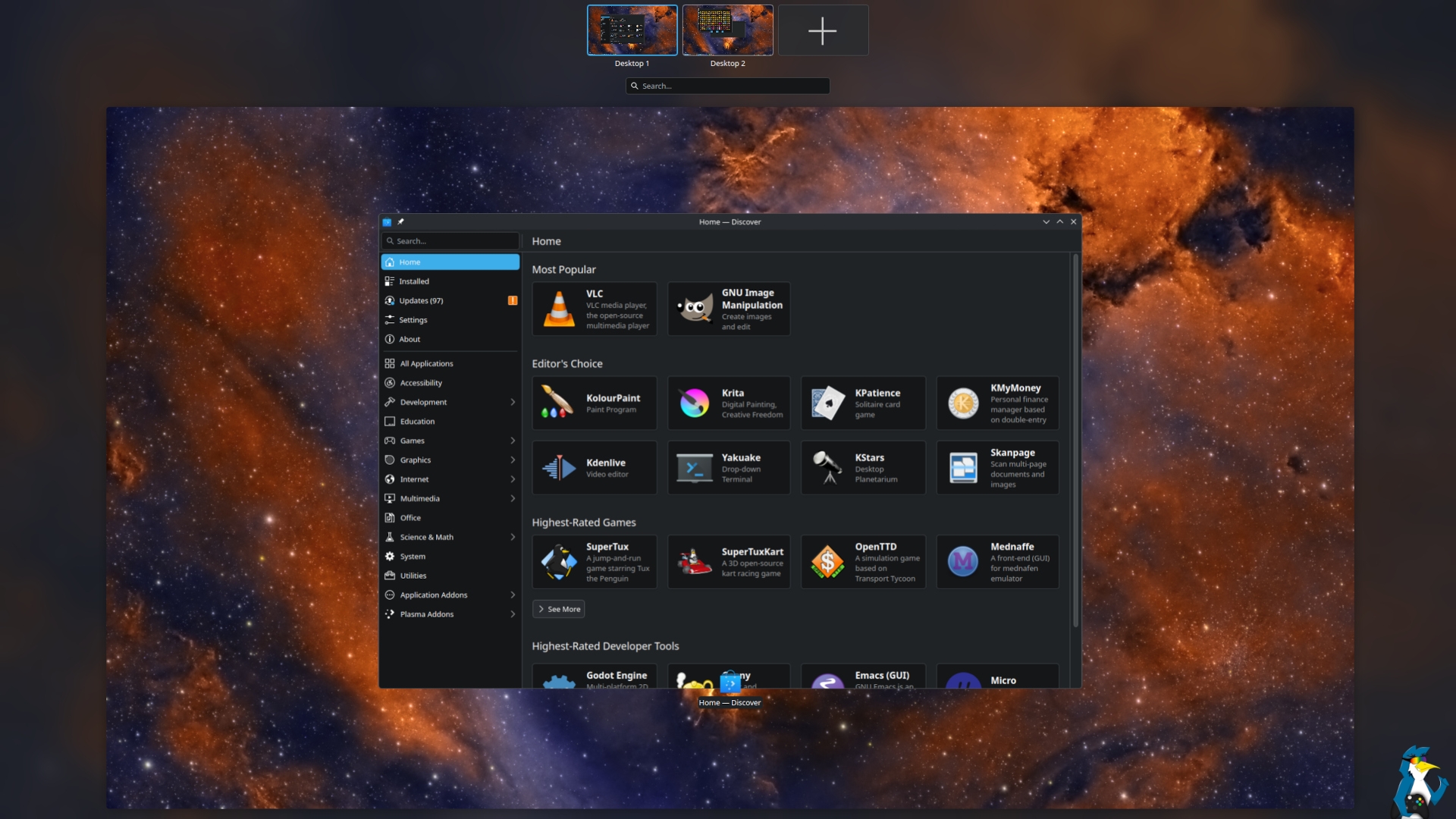 Pictured - KDE Plasma, multiple virtual desktops.