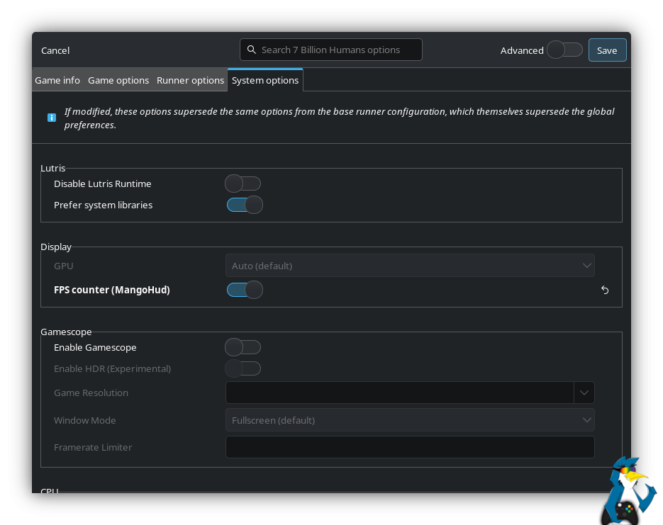 Lutris is another popular game launcher for Linux gaming. To use MangoHud with Lutris select a game, right click on it and select Configure. Go over to the System Options tab and tick the "FPS Counter (MangoHud) slider button: