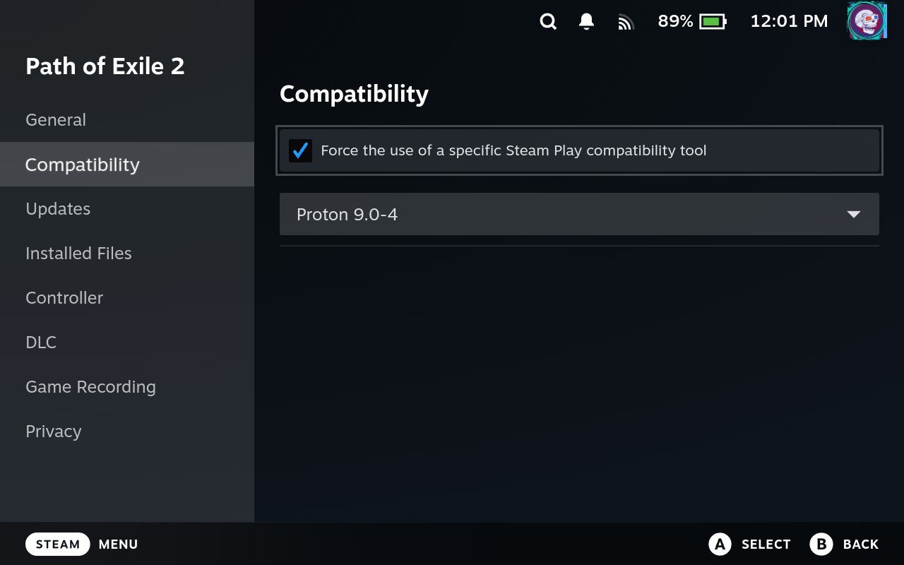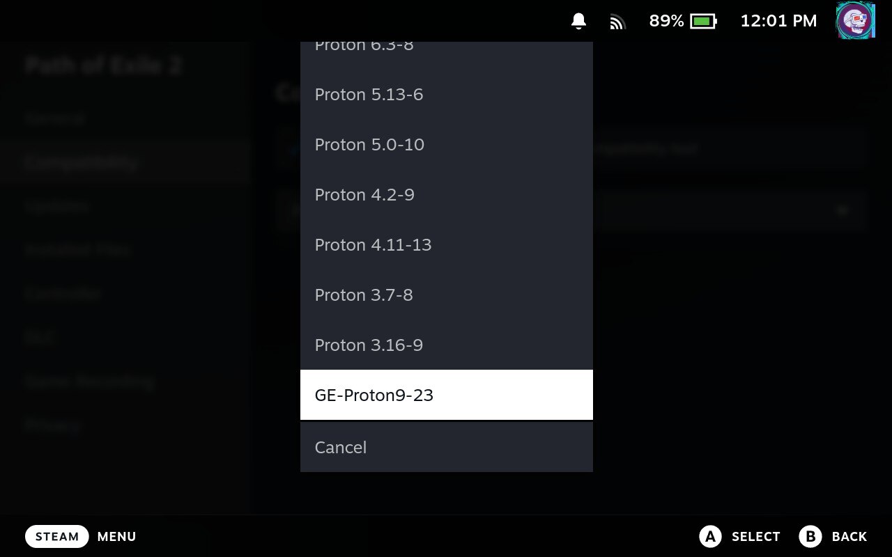 Doing this will show the drop-down box that in my screenshot below currently says Proton 9.0-4. Tap it and then it will open the drop-down box containing all versions of Proton you currently have installed.