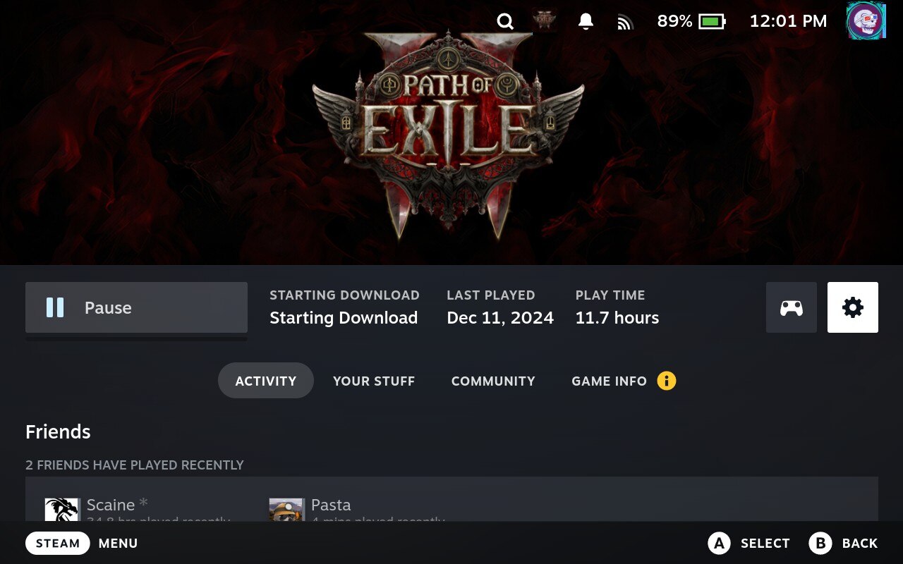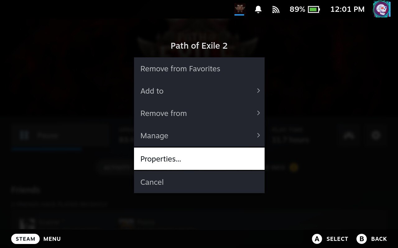 Inside Gaming Mode you can find any game in your Library, with Path of Exile 2 as my example, and go into the Properties (the little cog icon highlighted on the right).