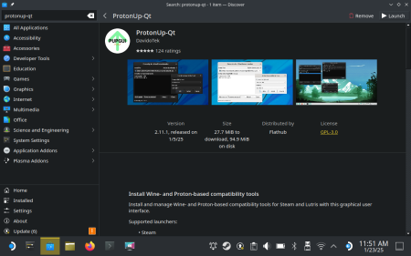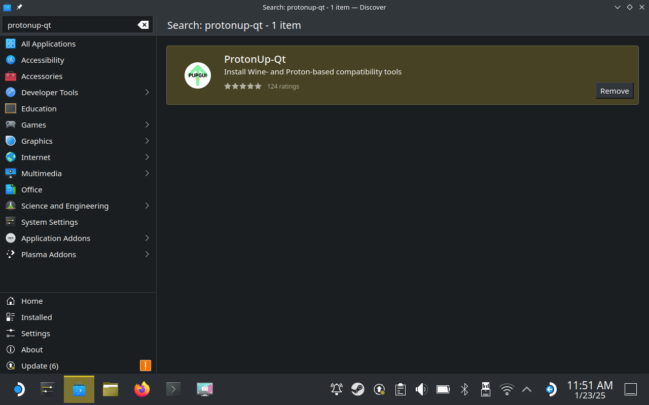 Now we want an app called ProtonUp-Qt, which allows you to easily install various different compatibility layers with a few quick button presses. Search for ProtonUp-Qt inside Discover.