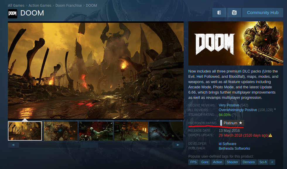 To make viewing the crowd-sourced ratings from ProtonDB a little easier, you can try the plugin "ProtonDB for Steam" (Firefox, Chrome) which adds the rating to store pages like this one for DOOM: