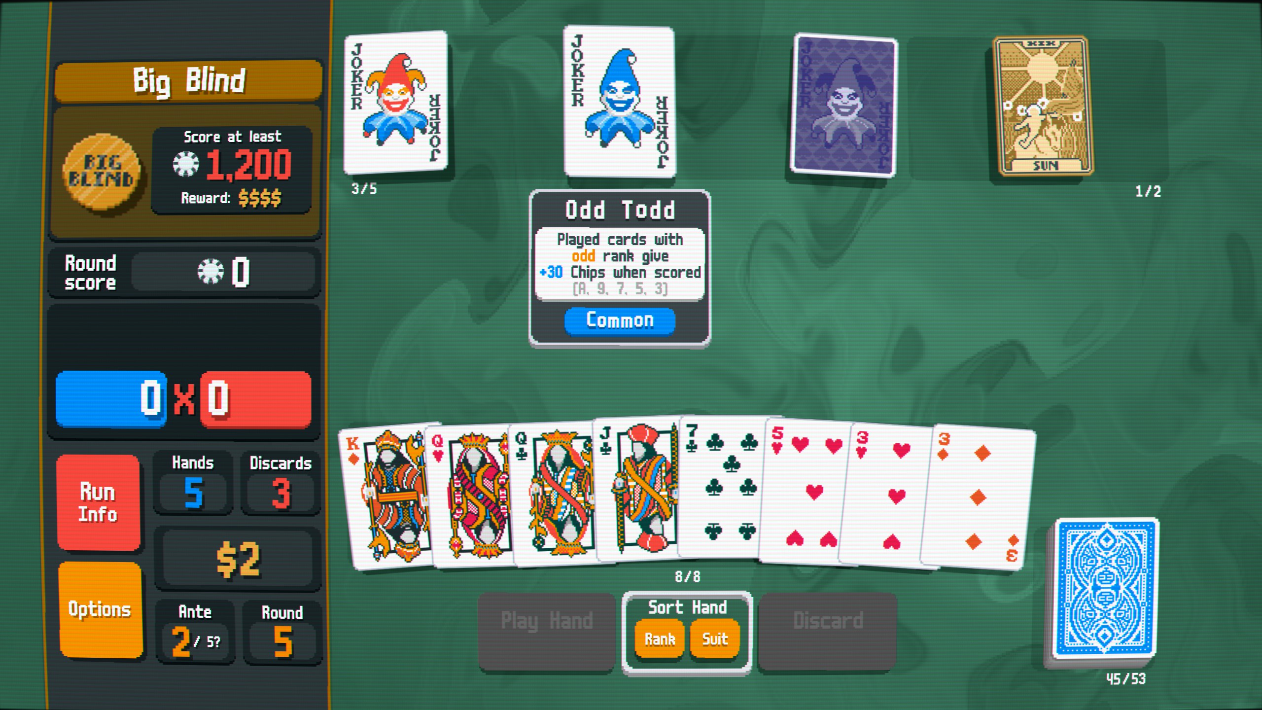 Like any good deck-builder it has special cards, and a card shop to keep changing your deck. What really makes it interesting are the Joker cards, there's 150 of them, each with their own special ability to change how your run goes and you can have multiple of them equipped at once. Like Odd Todd above, which gives me +30 chips for odd ranked cards when played.